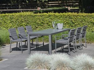 Life Outdoor Living Stelvio Dining Table with Primavera Stackable Dining Chairs Lava/Carbon