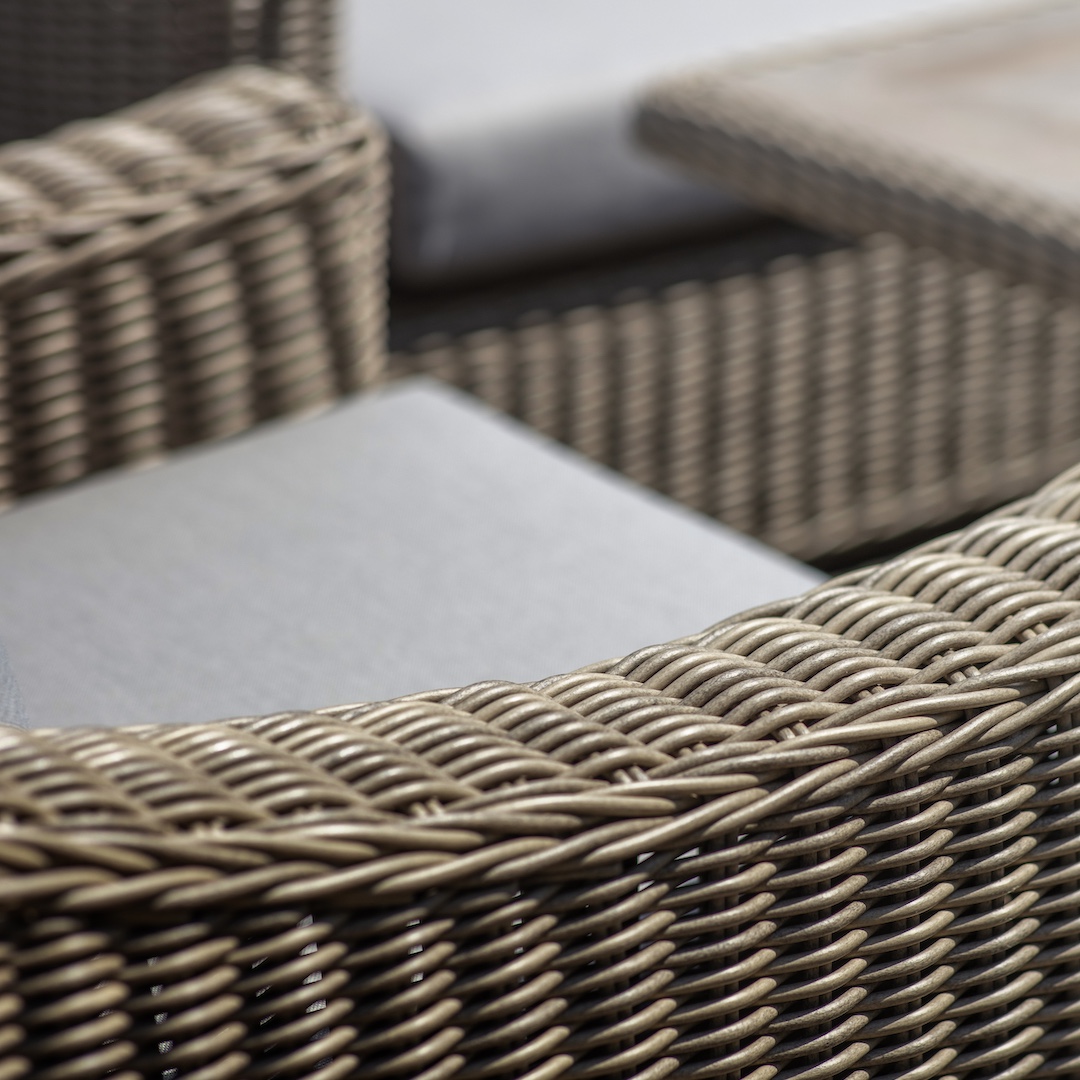 The Fairford 6 seat dining set offers the same refined mix of materials as the larger version but in a slightly more compact format. The ceramic tabletop is practical and easy to live with, while the woven walnut rattan and Eco Fawn Linen cushions create a welcoming, comfortable dining environment.