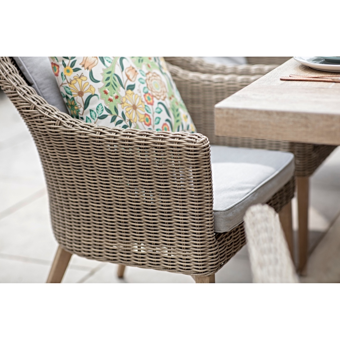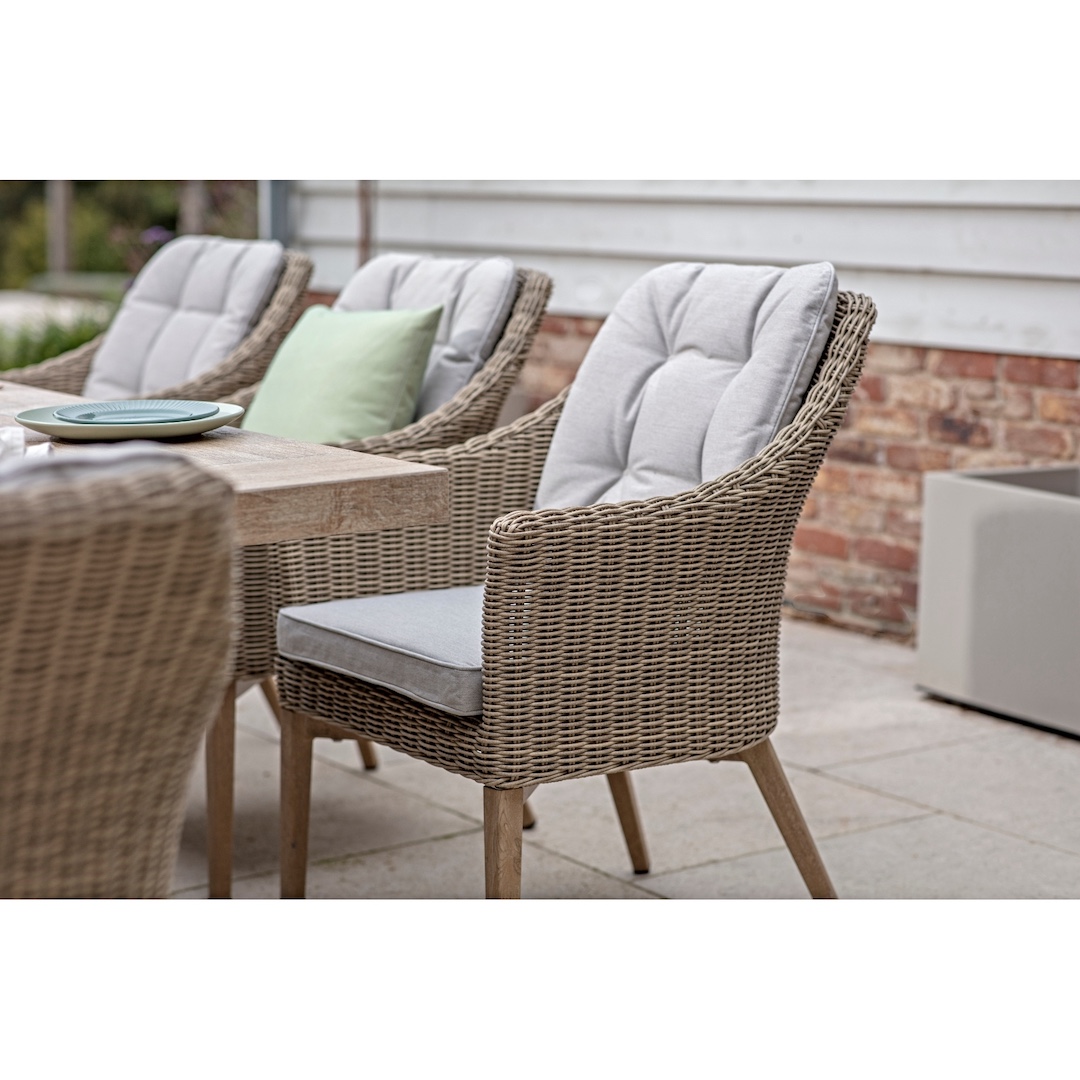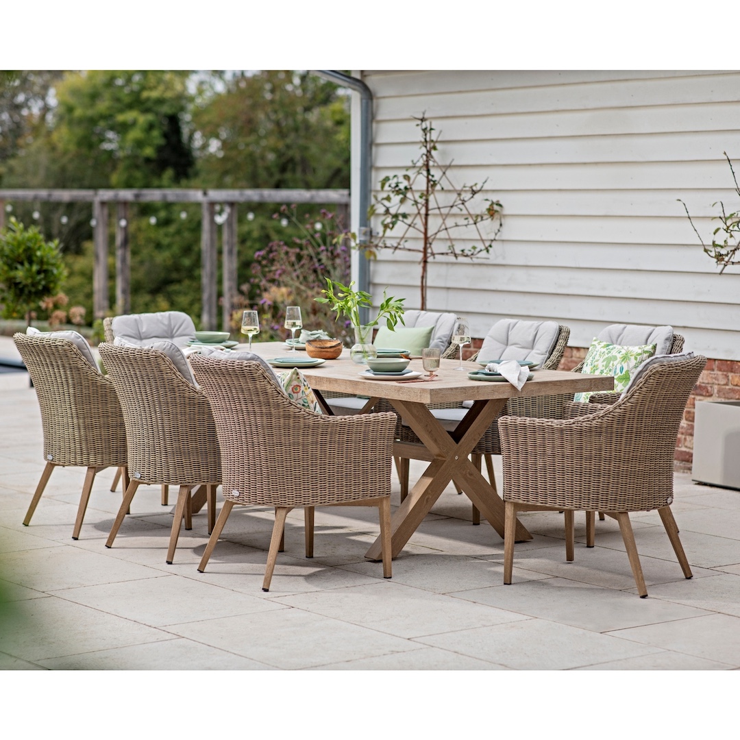 Designed for generous outdoor entertaining, the Fairford 8 seat dining set combines bold proportions with refined materials for a truly impressive garden dining experience. The ceramic tabletop offers a sleek, practical surface, while the handwoven walnut rattan and Eco Fawn Linen cushions on the NEW Fairford Vogue dining chairs, bring warmth and comfort to the setting.