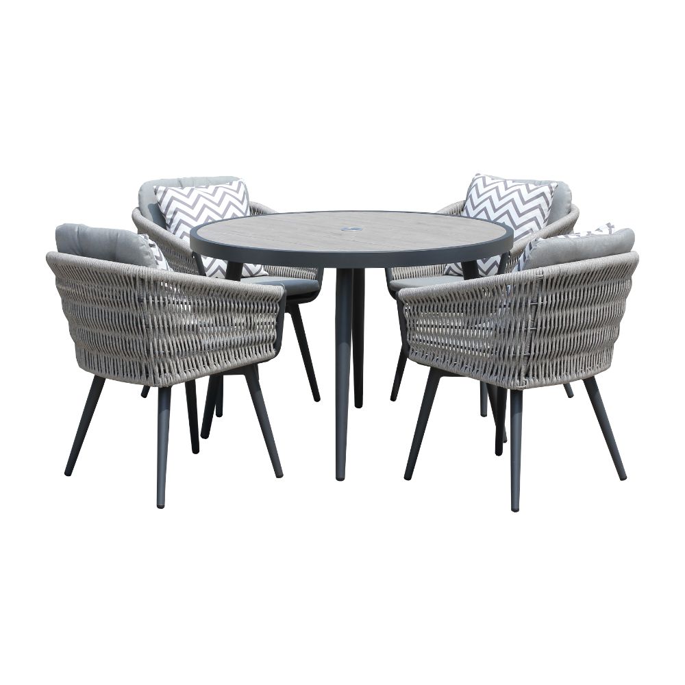 Mauritius has the appealing visual qualities of natural rope, but with the benefits of a durable synthetic product. Quick-drying and easy to clean. This spectacular range features a unique vertical rattan rope woven onto an aluminium frame with a gently rounded profile. Sophisticated speckled Heron Grey synthetic rope blends perfectly with the contemporary anthracite grey frame. The comfy light grey Cobble coloured cushions made from the Eco fabric which is spun from recycled plastic bottles completes the set.