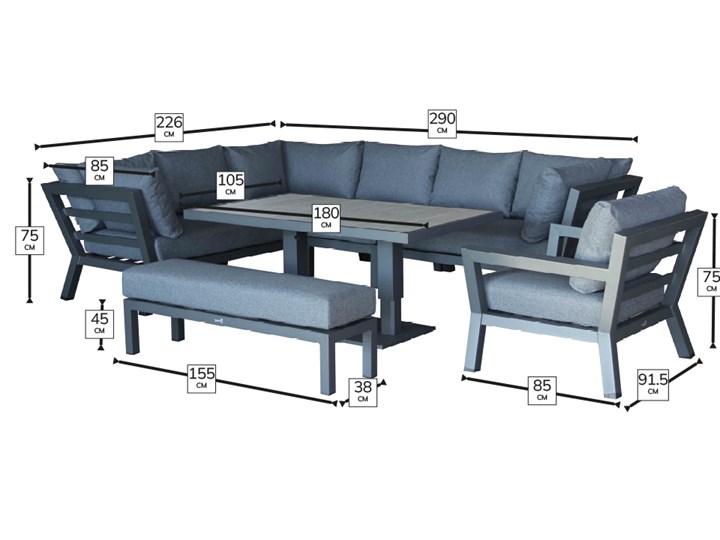 Larger than the standard set size -this modular San Marino L-shaped sofa set has a larger than standard adjustable table at 180cm x 105cm, and comes with the bench, sofa extender chair and sofa armchair
